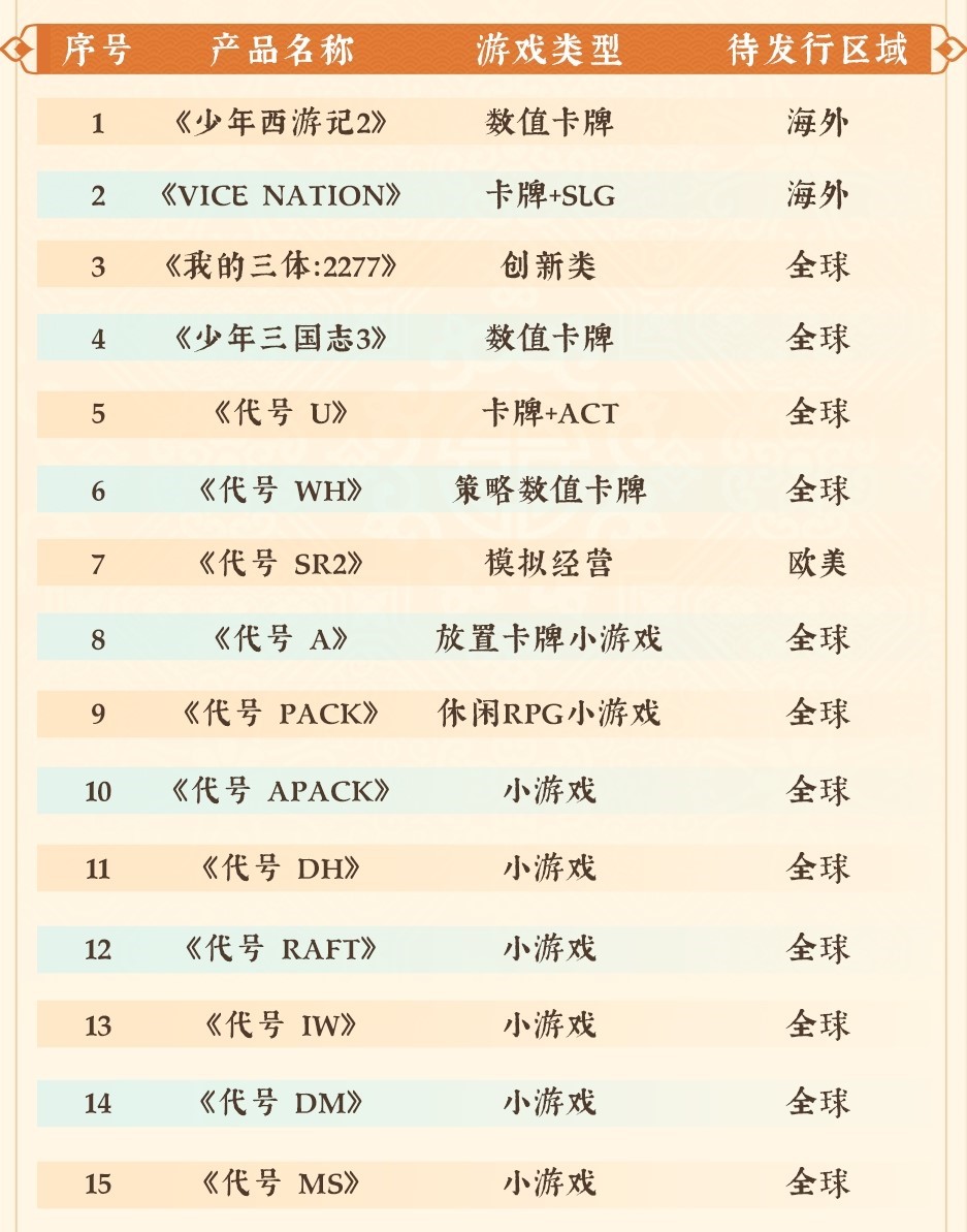 首款《三体》IP正版授权游戏《我的三体:::2277》已开放预约,,,另有现代都市题材SLG《Vice Nation》、、少年系列重磅新品《少年三国志3》、、、模拟经营全平台游戏《代号:::SR2》等产品储备。。。。此外在小游戏赛道上,,,《代号 A》《代号 Pack》《代号 DH》等也将陆续开启测试,,,,伴随多款新品的陆续上线有望进一步撬动增长空间。。