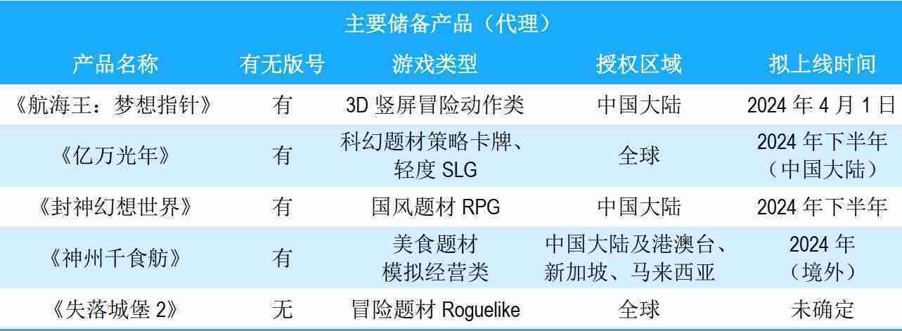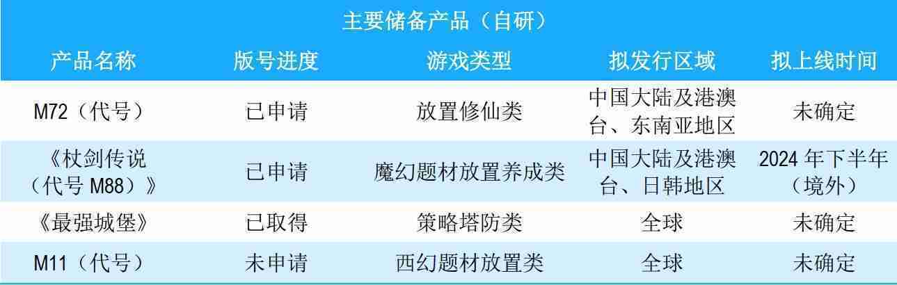 公司储备的多个自研、、代理产品都在有序推进当中,,涵盖放置类、、、、策略类、、模拟经营类、、、RPG、、Roguelike等多元化游戏品类,,,,储备的主要自研和代理产品如下:::