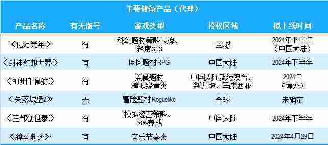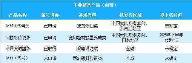公司有多款储备产品,,,,涵盖放置类、、、策略类、、、、RPG、、Roguelike等多元化游戏品类,,储备的主要自研和代理产品如下::